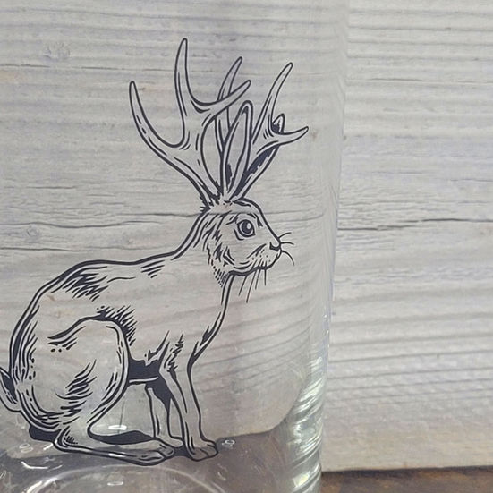 12 oz glass in can shape with black jackalope illustration by Counter Couture. Handwash Recommended.