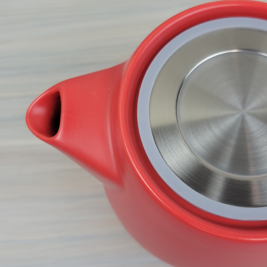 Matte red ceramic glazed teapot with stainless steel lid and infuser basket. 18 oz size. Dishwasher safe.