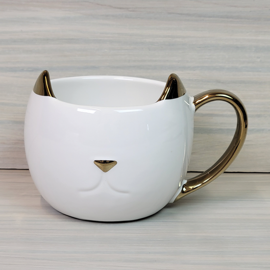Sweet glossy white glazed ceramic cat tea mug with gold ears, nose and handle. Also contains message inside cup at the bottom "Paws & Reflect". 12 oz size. Handwash recommended. Do Not Microwave.
