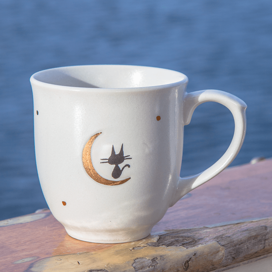 This beautiful 10oz black cat and gold moon mug is glazed ceramic . Hand wash, Do not microwave. Made in Japan.
