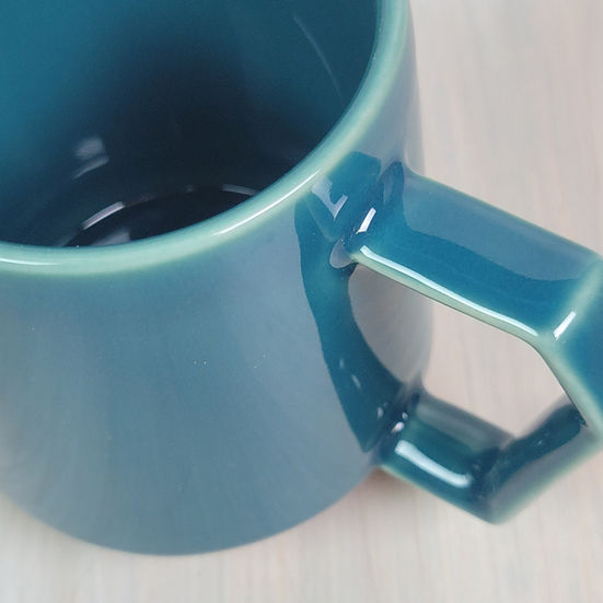 Special 12 oz ceramic glazed mug, with geometric handle and contrasting raw clay bottom. Available in other colors.