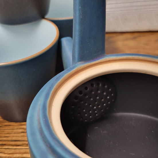 Modern and sleek, this tea set includes a ceramic glazed teapot with matching lid, 4 cups, tray and tea canister featuring rose gold wave engraved. Handwash recommended.